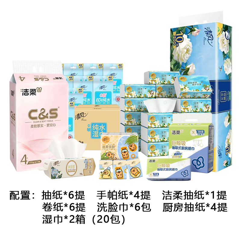 员工福利大组合(抽纸*6提/手帕纸*4提/洁柔抽纸*1提/卷纸*6提/洗脸巾*6包/厨房抽纸*4提/湿巾*2箱(20包))
