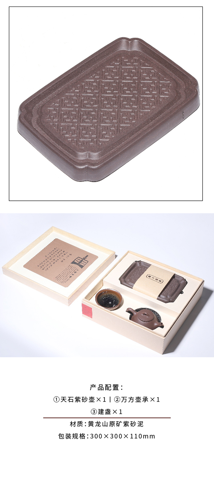 • 礼品规格:① 紫泥·石瓢壶 ×1把 ② 紫泥·万方壶承 ×1方 ③ 建盏·主人杯(兔毫纹) ×1只 ④ 实木挂画(永樂) ×1个 ⑤ 精致礼盒 ×1套
