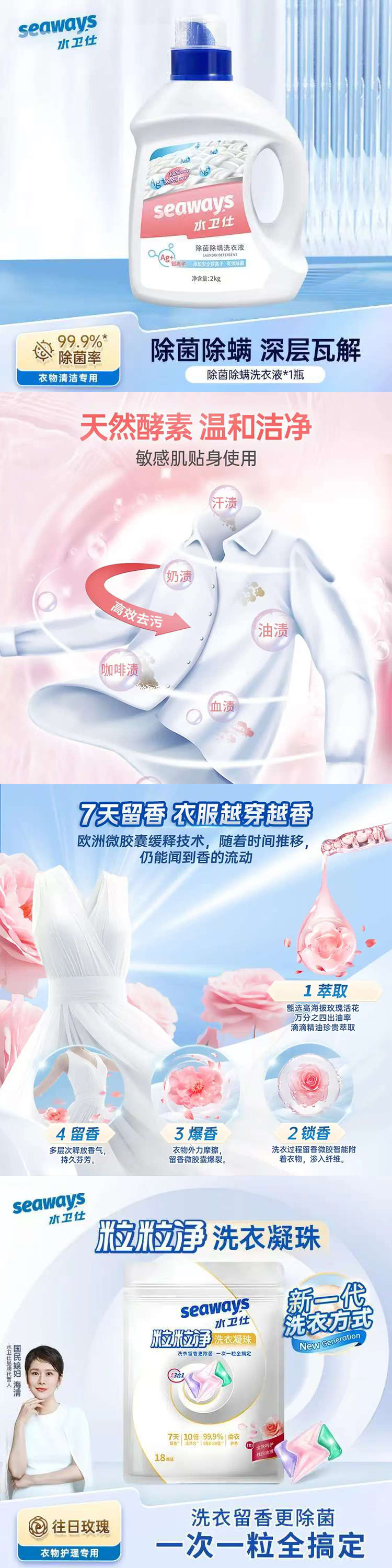 水卫仕套装:除菌除螨洗衣液2kg*1瓶+[粒粒净洗衣凝珠(全效呵护)]